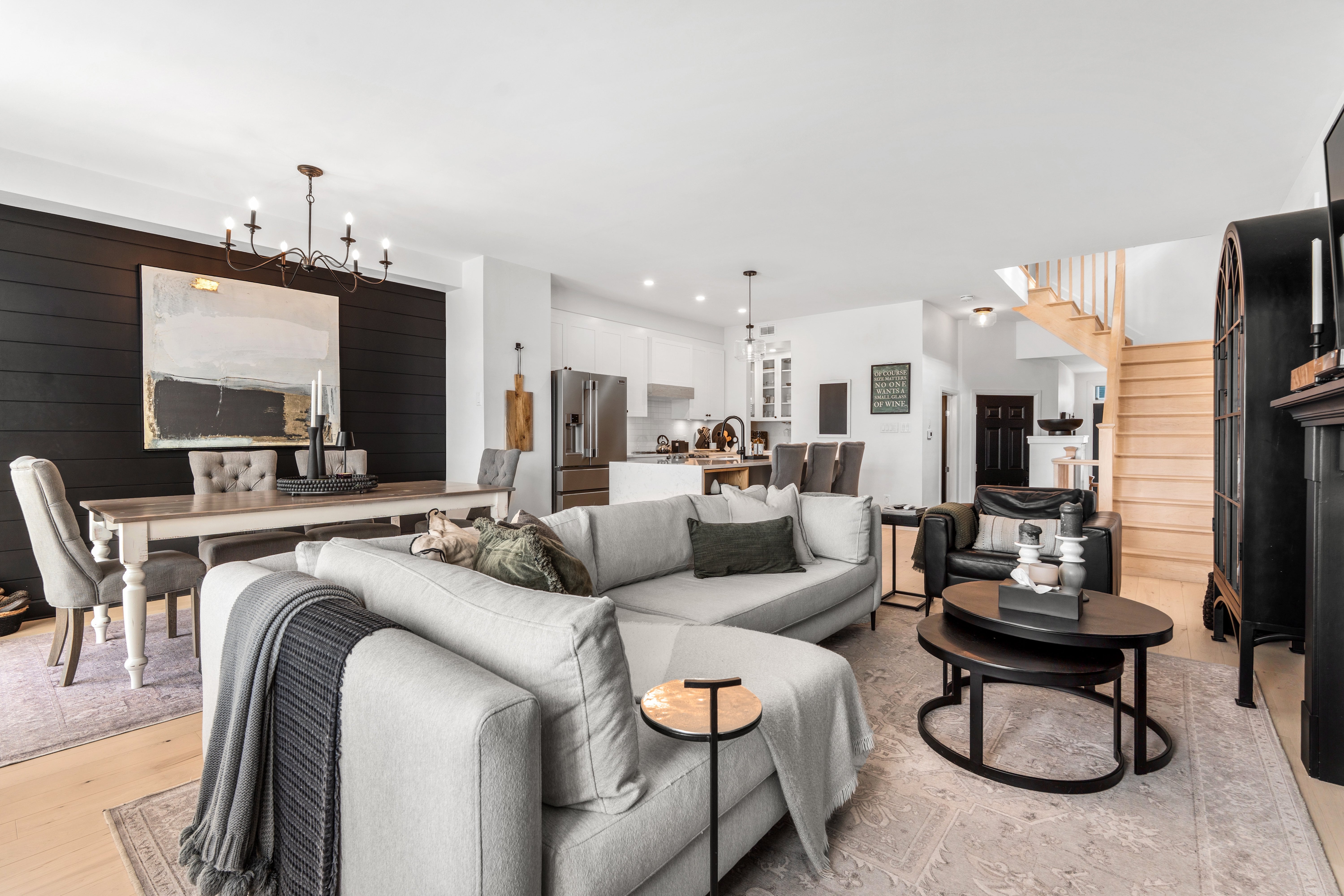 This premium Tamarack residence sits on a standout, fully landscaped lot with patio stone, a custom walkway, and manicured gardens that create an inviting entrance. The backyard is a private retreat with a relaxation hot tub, professional turf for low maintenance, illuminated steps, a raised flower garden, a full fence, and an expansive deck with zones for lounging, dining, entertaining, and storage. With the property backing onto St. Genevieve Catholic School and a new park and walking paths coming soon, this West-End location delivers long-term convenience and family-friendly appeal. Inside, the home showcases quality craftsmanship and a bright, open main level with Maple cabinetry, a custom coffee bar and pantry, quartz countertops, a waterfall island, professional stainless steel appliances, California shutters, and a warm gas fireplace. A beautifully crafted staircase, custom cabinetry, refined finishes, and a stylish powder room elevate the space. The lower level offers a cozy, flexible area for a movie lounge, music space, or children's playroom, plus a rough-in for a future fourth bathroom. Upstairs, the large primary suite features a king-sized layout, walk-in closet, and spa-style ensuite with a soaker tub. A well-designed upper-level laundry room includes quartz counters, a wash sink, cabinets, a folding station, and Electrolux appliances. Two additional bedrooms and a four-piece bath complete this level. With 2,200 sq. ft. of finished living space, upgraded lighting, an extended driveway, full eavestrough system, Celebright exterior lighting, and EV-ready wiring in the garage, this executive townhome blends upscale finishes with modern functionality. A must-see opportunity.